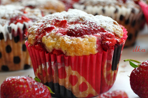 2 szkl. mąki, 1/2 szkl. cukru, 1, 5 łyżeczki sody, 2 jajka, 1 szkl. jogurtu naturalnego, 1/4 szkl. rozpuszczonego masła, 1 szkl. pokrojonych truskawek, odrobina brązowego cukru.